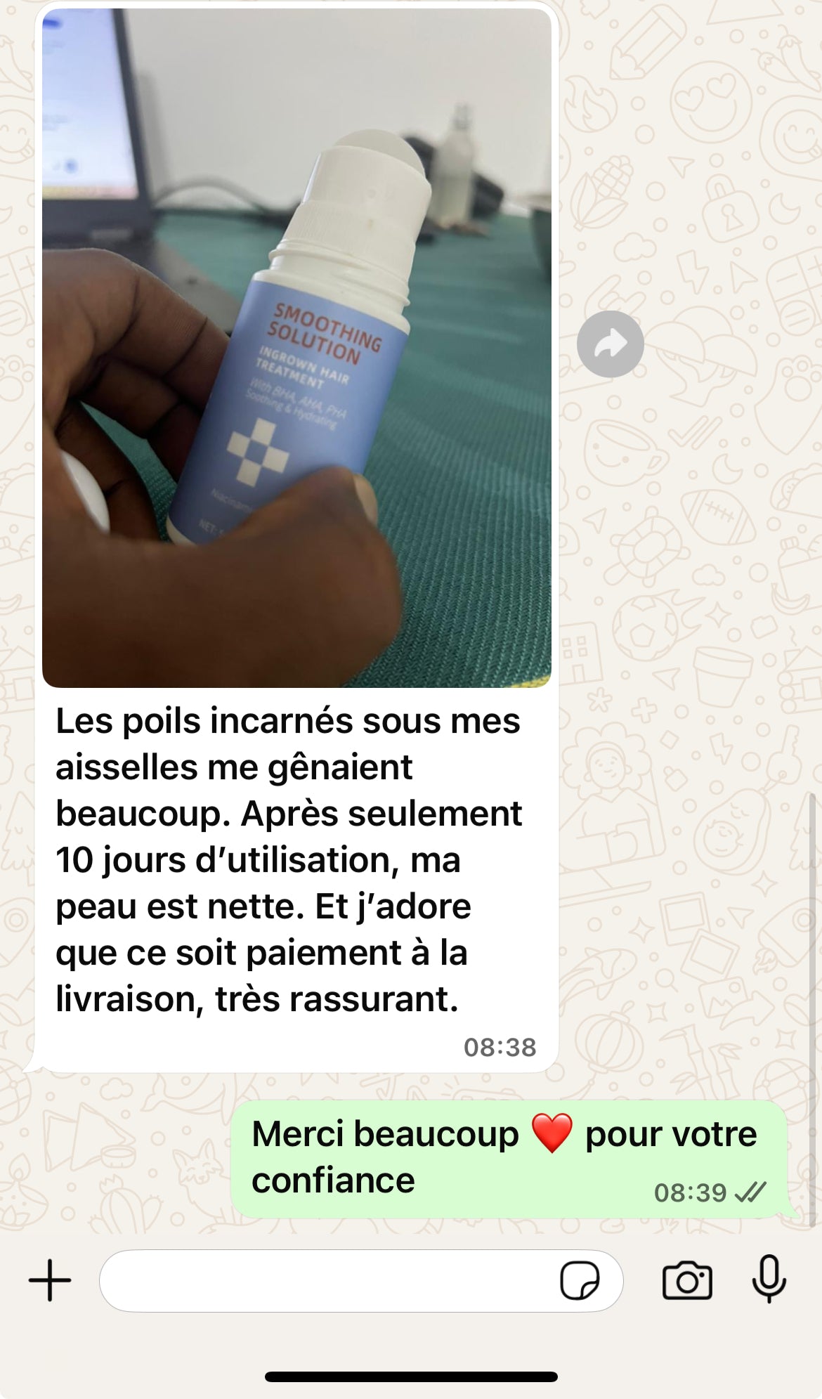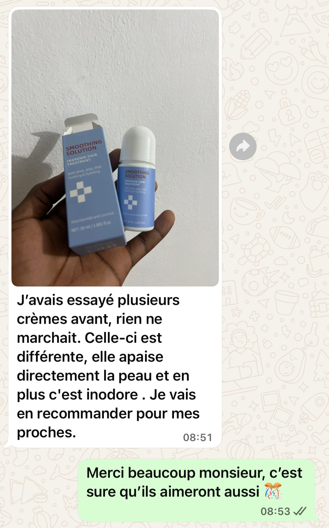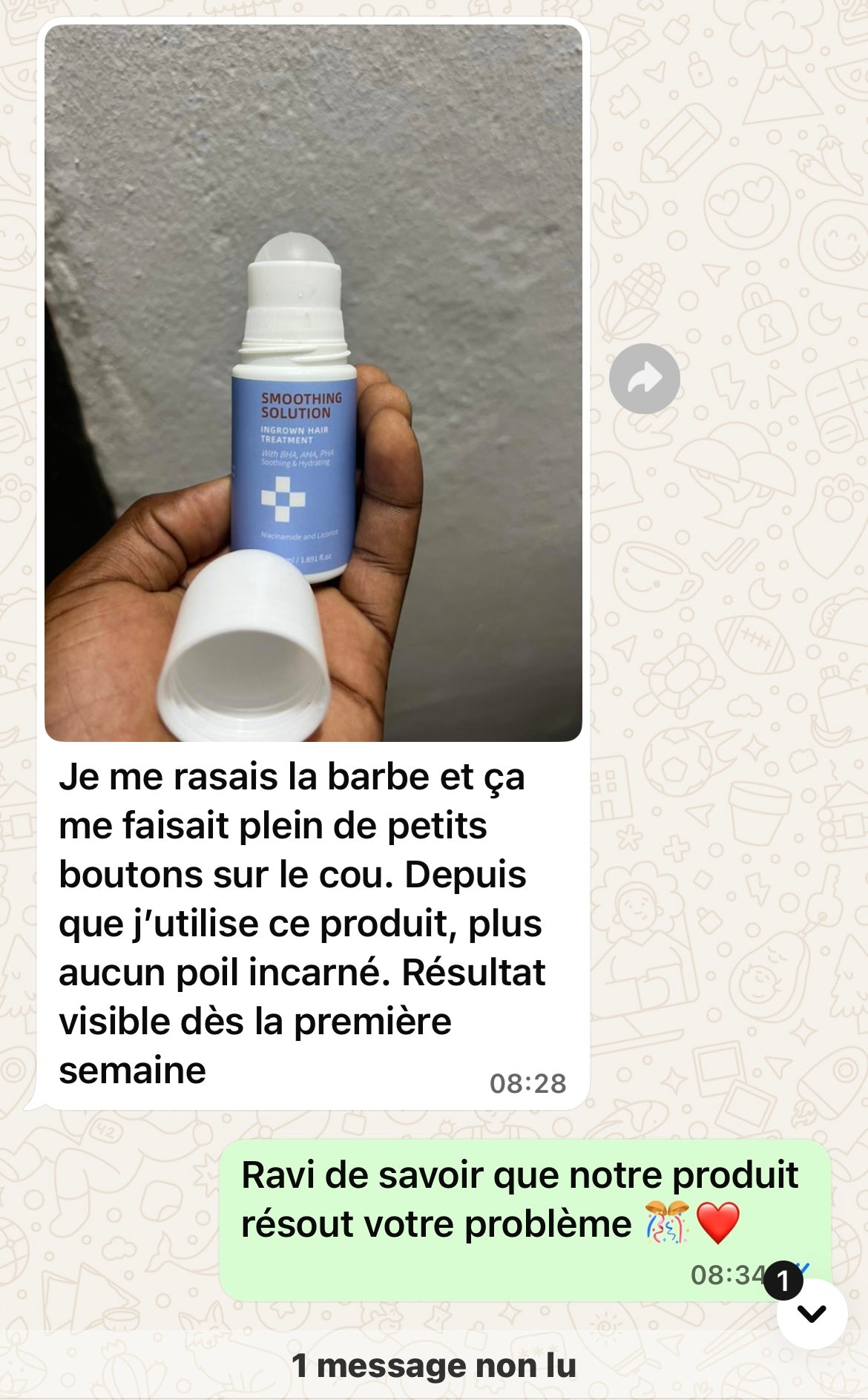 Oui, il est spécialement conçu pour prévenir et réduire les bosses du rasoir et les poils incarnés. La formule combine de l’acide salicylique (BHA) pour désobstruer les follicules, de l’acide glycolique (AHA) pour lisser la surface et de la niacinamide pour calmer les rougeurs. La plupart des utilisateurs voient des résultats visibles dans les 3 à 7 jours.